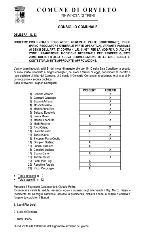 - La variante al PRG, per la nuova perimetrazione delle aree boscate, è stata definitivamente approvata con delibera di C.C. n 33 del 21 maggio 2012.