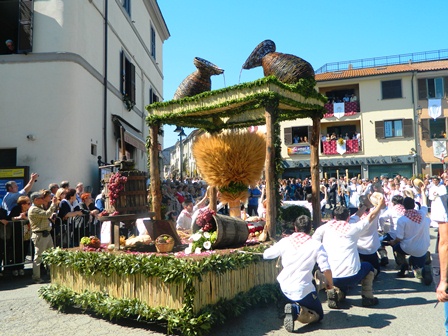 I “Casenghi”, i “Bifolchi”, i “Villani” e i “Pescatori” hanno portato anche quest’anno, come vuole la tradizione, le proprie offerte simboliche alla Madonna del Monte: fiori e primizie del lavoro dei campi accuratamente selezionati e disposti ordinatamente in modo da creare una composizione unica e originale.