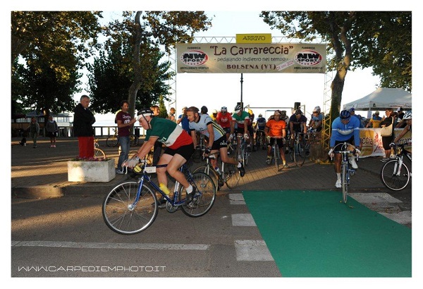 Alla 4^ edizione la cicloturistica dell’Alta Tuscia su bici d’epoca si conferma la più importante d’Italia dopo La ormai ventennale “L’Eroica” Toscana di Gaiole in Chianti. Domenica 14 settembre sono stati ben 450 i partenti a Bolsena per compiere i differenti tracciati dal più corto di 55 km che faceva il periplo del lago di Bolsena, al più lungo di 135 km che toccava per la prima volta la città di Orvieto con ristoro e timbro proprio nella splendida piazza del Duomo. Il percorso lungo insieme al medio toccava poi dopo un lungo tratto sulle strade che attraversano i vigneti orvietani, la cittadina di Lubriano con vista sulla leggendaria Civita di Bagnoregio, per ricongiungersi di nuovo sul percorso sterrato del lago per toccare infine il lago di Mezzano e la cittadina di Gradoli prima di fare ritorno alla rotonda del lago a Bolsena.