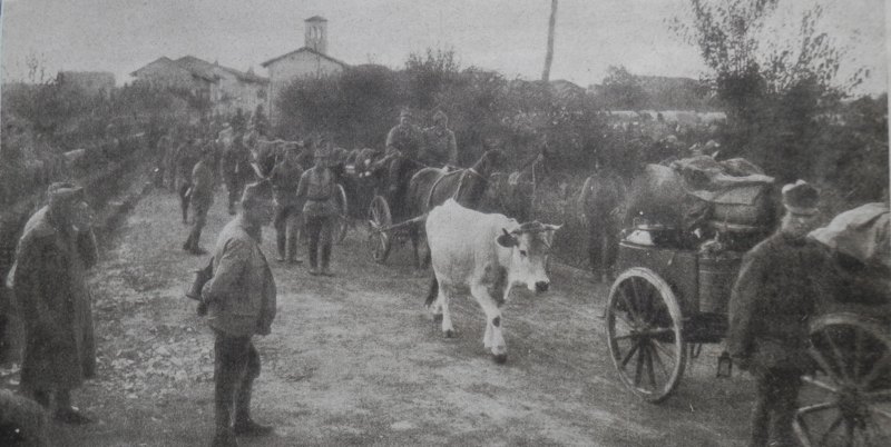 – Altre immagini documentano, come sempre succede, come le truppe, seppure perdenti, si abbandonano a saccheggi e depredazioni. Una in particolare mostra il passaggio dei soldati nemici catturati con l’intero bottino, compreso un bell’esemplare bovino in primo piano.