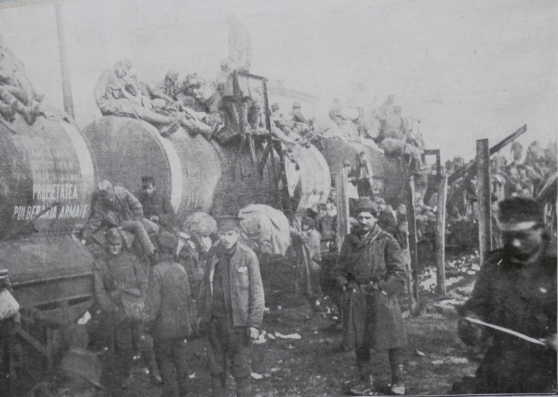 – C’è poi una foto scattata alla stazione di Bressanone che immortala “la presa d’assalto” del treno dai soldati in fuga, arrampicati fin sopra la locamotiva a vapore.