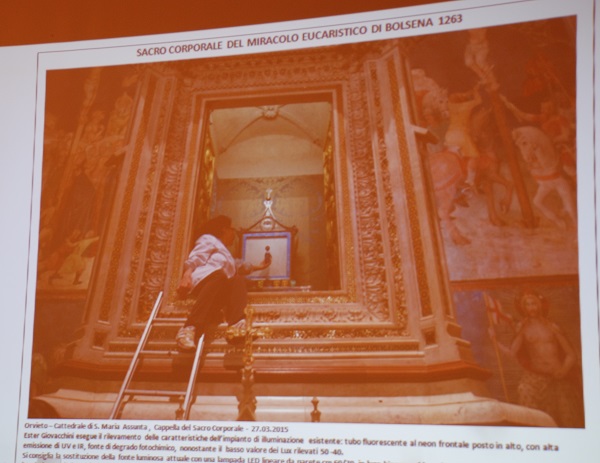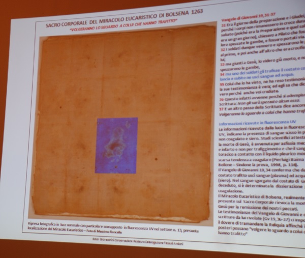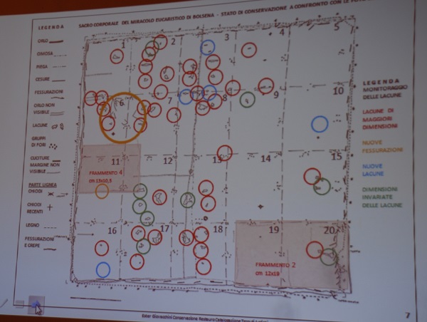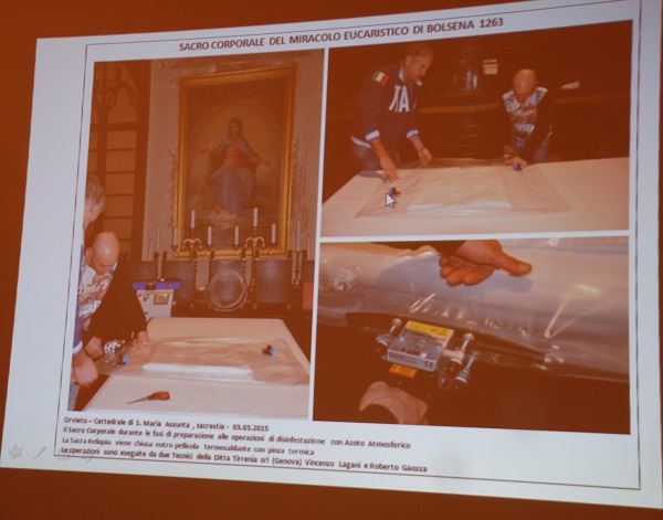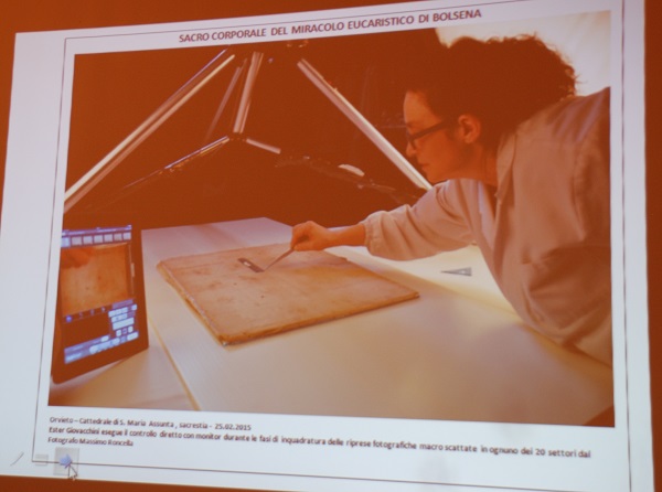 Ma andiamo con ordine. Cosa è stato fatto?. Innanzitutto la reliquia è stata rimossa dalla teca. E’ così stato evidente il metodo di ostensione attuale del Corporale, ancorato ad ago su un tessuto in raso di seta avorio sua volta applicato ad una tavoletta di legno con una sessantina di chiodi. Un supporto – quello del raso e della tavoletta – che – è stato osservato – provoca tensioni e ha notevolmente danneggiato la reliquia negli ultimi 37 anni. Quindi è seguita a fase di studio e osservazione, supportata anche dall’esperta in restauro ligneo, pittorico e metriale lapideo Danielle Yvone Dusoczky e dalle foto in luce normale e in fluorescenza ultravioletta di Massimo Roncella. La tela di lino si presenta divisa in 20 settori rettangolari. L’esperta Ester Giovacchini ha tra l’altro individuato anche il settore in cui sarebbe orginariamente caduto il sangue del Miracolo tramite lo studio delle pieghe del lino aiutato da scansioni e foto.