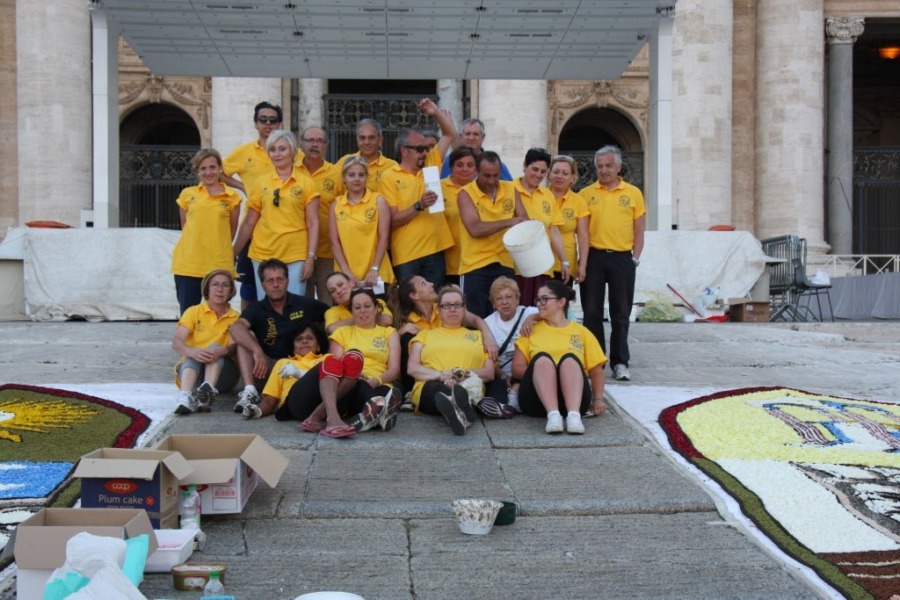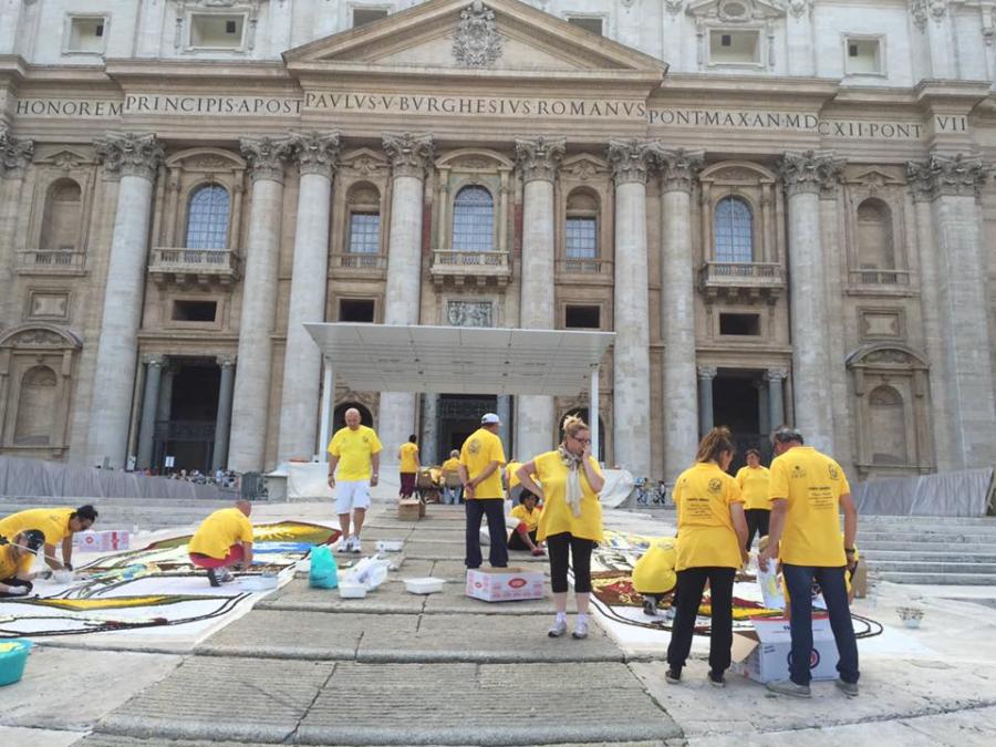 Certo indossare sul sacrato di S. Pietro le magliette che recavano il logo dell’Associazione Infioratori Bolsena e il logo anche di Orvieto in fiore è stato un ulteriore graditissimo regalo che ci hanno fatto. Vi era inoltre stampata la frase di Papa Paolo VI pronunciata nella sua visita a Bolsena l’ 8 agosto 1976 per chiudere il congresso eucaristico internazionale :“Bolsena e Orvieto conservano e alimentano nel mondo l’inestinguibile fiamma”. Dalle 9 del 2 giugno, mentre a Roma si svolgevano le cerimonie della festa della Repubblica, e sfrecciavano le frecce tricolori, fino alla sera alle 21, sul sacrato di S. Pietro osservati con curiosità da innumerevoli turisti, il nostro manipolo lavorava alacremente alla realizzazione di due grandi infiorate (metri 9 per 3) rappresentanti la messa del miracolo di Bolsena di Raffaello Sanzio, che avrebbero fatto da ala al passaggio di Papa Francesco.