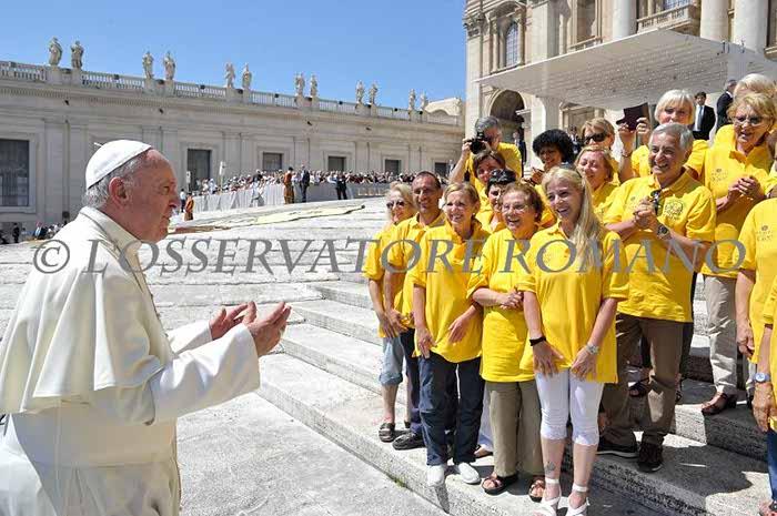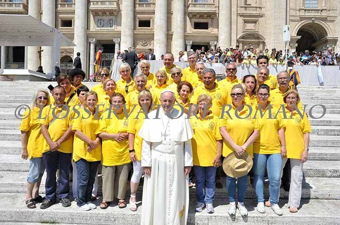 Per l’udienza generale del mercoledì, inizia già dalle 7 l’arrivo dei fedeli, il nostro gruppo posizionato all’interno delle transenne in posizione privilegiata attende l’arrivo di Papa Francesco che alle 9,45 fa il suo ingresso nella piazza, percorrendola in lungo e in largo con la papa mobile, poi nella sua omelia sulla famiglia e le sue difficoltà, legate ad alcune situazioni contingenti come la povertà e la mancanza di lavoro ricorda a tutti noi di non voltare lo sguardo, ma di aiutare chi si trova in condizione di necessità.