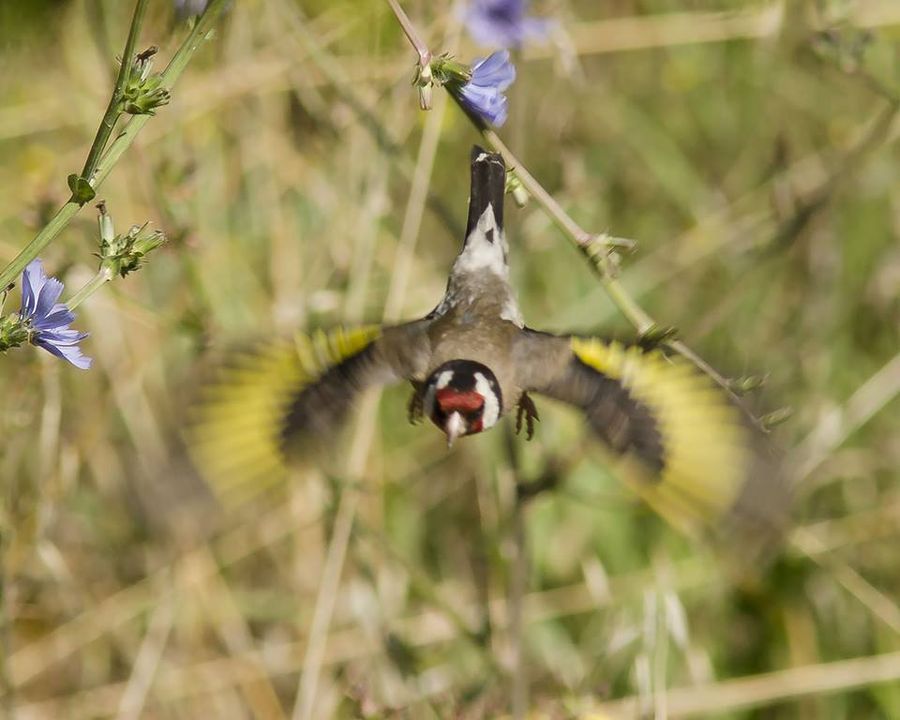 Cardellino prende il volo dopo aver mangiato semi di cicoria.