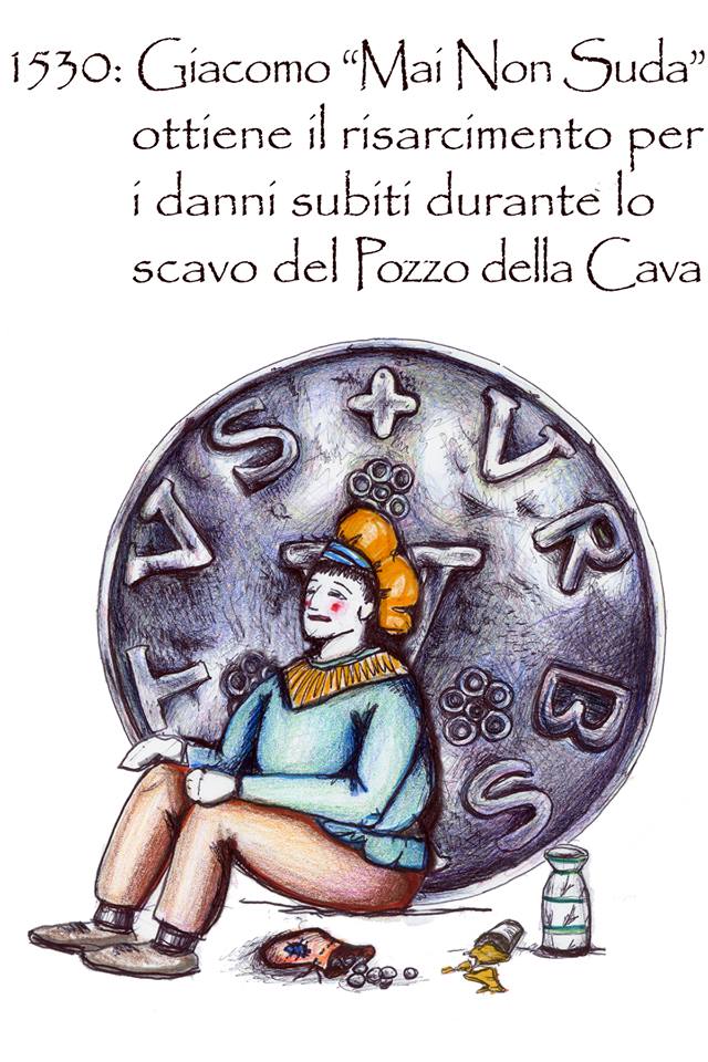 E poi lanciare in maniera sempre più forte la linea dei prodotti tipici legati a cinque personaggi cavajoli magistralmente illustrati da Alessandra Roticiani, in arte XaNa. Si tratta di quattro vini e un amaro con etichetta del Pozzo della Cava, legati a cinque personaggi le cui storie si intrecciano a quelle del pozzo e del quartiere: