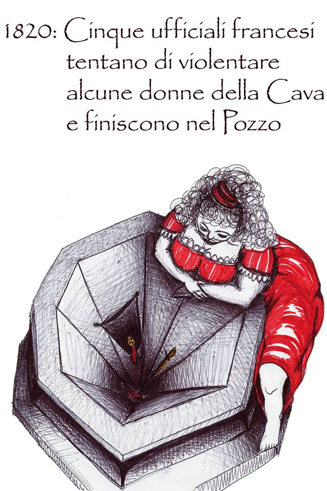 – conclude la serie l’Amaro del Pozzo (che qualche tempo fa la rivista Class ha collocato al terzo posto della classifica degli amari e liquori italiani) con l’immagine di una delle donne che cinque ufficiali francesi hanno tentato di violentare ad inizio Ottocento, finendo miseramente nel pozzo ad opera dei mariti e dei fidanzati delle giovani cavajole.
